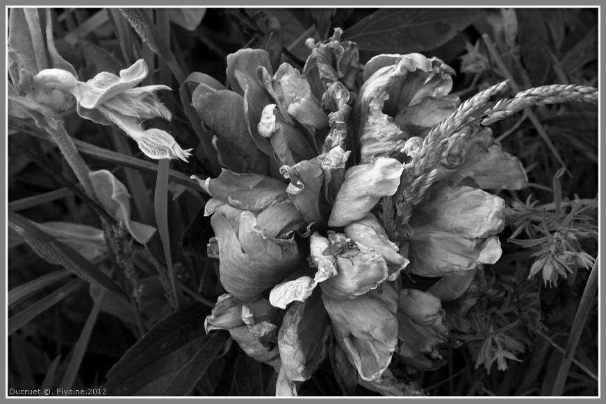 | PIVOINES .... Elles éclosent et se précipitent, ne durent pas, fatiguent au vent. Ce sont les fleurs de la fin du printemps quand les lumières sont encore acides et les couleurs plus froides. En noir elles ont davantage de matière et de volume qu'en plein air, solides dans l'espace et courageuses dans le naufrage... Sans parfum, peu visitées rutilantes ou virginales ...Invendables coupées, fanées dans les heures qui suivent leur séparation d'avec la terre, moins domestiques que les chats... En somme, plus libres que les roses et débarrassées du fardeau des métaphores. Un amour de fleur. | ||
