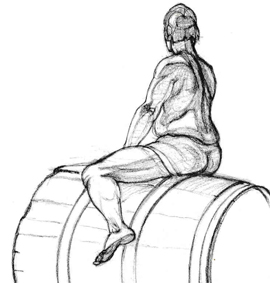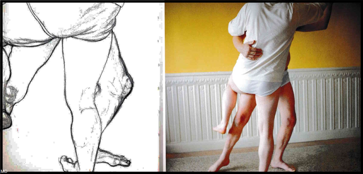 Deux hommes prennent des poses avec uns espèce de maladresse. Ils sont en liquette ou torse nu, ils ont des caleçons informes, ils ont du ventre, de la différence d'âge....Ils ont l'air peu entraînés à la mise en scène... le décor consiste en un mur jaune avec une boiserie artificielle comme dans les bistrots de campagne des années cinquante, le sol est lisse et brillant, la lumière sur le côté. Sinon, les choses se passent en plein air, au milieu d'arbres fruitiers...Les deux personnages dansent un tango peu langoureux, essaient de lutter, font semblant de démarrer une course... Ils s'offrent un fruit, croisent aussi les mains sur leur ventre comme nos grands parents chassés du Paradis Terrestre... On singe ici des thèmes de la grande peinture renaissante ou baroque, la mort de Procris, les coureurs de Poussin... Le punch de ces photos sans contexte social ni politique, où les corps se distinguent par quelques parallelismes et rondeurs, où s'expriment les saillies et les bosses de la filiation, c'est de faire remonter de vieux souvenirs, assez proches des mythes et plutôt près des ridicules.... Voilà qu'on laisse parler des membres, des abdomens, des rachis, des épaules, et des nuques pour faire taire certains bavards qui parlent trop de l'Homme. Les dessins de leur côté, poussent la métaphore à la main. Technique vieille de cent mille ans, à peine plus jeune que l'intelligence, travaillée sur des parois et reprise infiniment. Pour peser les hommes les crayons pèsent les âmes, cernent les parts de non-sens, les plaisirs répétés, les tournures. Dans la balance il suffit d'une épaisseur de mine pour expédier au ciel ou en enfer . Tel est le dessin, cosa mentale, si balourd aux mains des vulgaires, impitoyable quand l'esprit s'y promène au lieu des pieds. Le croisement des photographies et des dessins génère d'autres "créations" de l'Homme que celle du Verbe. Puisque nous sommes condamnés au "réchauffement planétaire" c'est à dire à l'oubli forcé de nos identités pour le moins et pour le pire à des gesticulations morbides,voyons comment sortir d'un humanisme passé à l'industrie des déchets. D'abord nous sommes en face de figurants peu entraînés à la comédie, que la photographie réduit en masses rosées, projette hors du contexte socio-culturel par le biais des postures du bal, de l'étreinte, de la culture défunte et du comique...La fille prend des photos de ceux que sa mère dessine, photographie son père et son frère mais sa mère dessine un fils et un époux, ce qui fait des angles de tirs où les regards tapent différemment au physique comme au mental... Ce qui brille sous nos yeux prend un air de miroir aux alouettes où rien ne risque de faire regarder ailleurs... Nous sommes opérés de cette cataracte de la perspective unique, plaie occidentale qui consiste à ne voir que d'un oeil dans une direction choisie que l'on appelle la bonne puisqu'il n'y en aurait pas d'autres. Cette maladie reste commune aux écrans de télévision ou du cinéma d'affaires. Pourtant les impressionistes avaient su nous sortir du blanc et du noir, c'est à dire du scientisme et de la religion ces deux profils des manchots de la perception. Mais , hélas, la Société des hommes est aussi divine que le Veau d'or du désert et les professeurs d'Art font de bons adorateurs des jours de fête. Alors quel espace pour la filiation ?Quelle "Nature" et quels amis pour des corps nés les uns par les autres? A qui doit faire plaisir le Soleil ? Quand les patrimoines passent devant notaire, experts et agents du fisc, c'est qu'on est en poussière... Alors que les chimères, les danses, les éclats de voix, les déguisements, les blancs des yeux, les fraîcheurs de l'âme filent vers les nuages... Dans un mélange incestueux de genres, de techniques, de motifs, la famille nuclaire se sauve ici du temps contraint, des assignations à résidence et se recompose pour des loisirs à peine différents de ceux des premiers jours... Une sorte de liberté, de pacte de sang et de coeur se dessine comme ces figurations magiques de l'ancienne Egypte qui promettaient l'éternité des promenades et des vols d'oiseaux sous le Disque solaire imperturbable. Pour combien de temps ? M. Ducruet. Photographies Diane Ducruet, Dessins Sophie Ducruet, Textes Michel Ducruet, Figurants : César Ducruet, Michel Ducruet. |